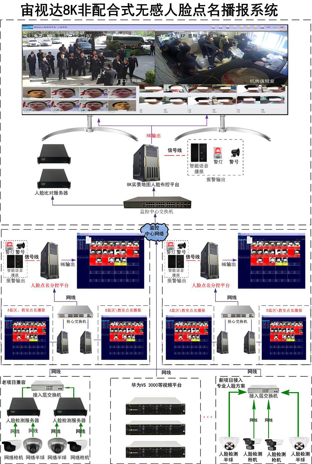 无感人脸点名播报系统是专门为司法领域、会议场所、学校宿舍以及学校班级等场所大楼出入口、教室,会议室、生产区域等场景量身定制的一套解决方案,通过人脸检测摄像机、人脸比对服务器、人脸布控平台、人脸点名分控平台及人脸点名播报等软硬件技术,实现非配合式的无感点名播报功能,全面优化与改进目前配合式点名影响工作效率,现场操作十分繁琐等问题。